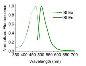Broccoli TM /BI 在 pH 7.4 緩沖液中的吸收和熒光發射光譜。
